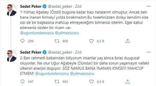 Sosyal medya hesabından paylaşım yapan Peker, ''Ne olur Uğur Ağabeyle (Dündar) bir daha sorun yaşamayın vallahi ülkenin enerjisi düşüyor'' ifadelerini kullandı.