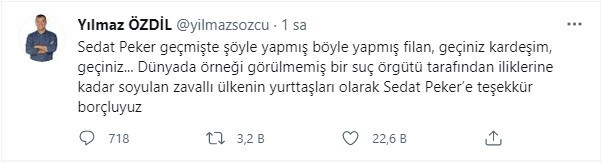"Sedat Peker geçmişte şöyle yapmış böyle yapmış filan, geçiniz kardeşim, geçiniz... Dünyada örneği görülmemiş bir suç örgütü tarafından iliklerine kadar soyulan zavallı ülkenin yurttaşları olarak Sedat Peker’e teşekkür borçluyuz"