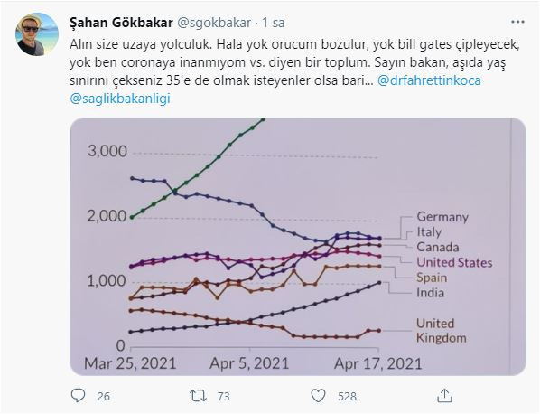 "Alın size uzaya yolculuk. Hala yok orucum bozulur, yok bill gates çipleyecek, yok ben coronaya inanmıyom vs. diyen bir toplum. Sayın bakan, aşıda yaş sınırını çekseniz 35'e de olmak isteyenler olsa bari... "