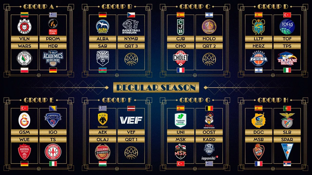 Galatasaray; Igokea m:tel, FIT/One Würzburg Baskets ve Pallacanestro Trieste ile birlikte E Grubu'nda yer aldı. Mersin Spor da G Grubu'nda Unicaja, Filou Oostende ve Karditsa Iaponiki ile eşleşti. Tofaş ise D Grubu'nda La Laguna Tenerife, Bnei Penlink Herzliya ve Trapani Shark ile karşılaşacak.