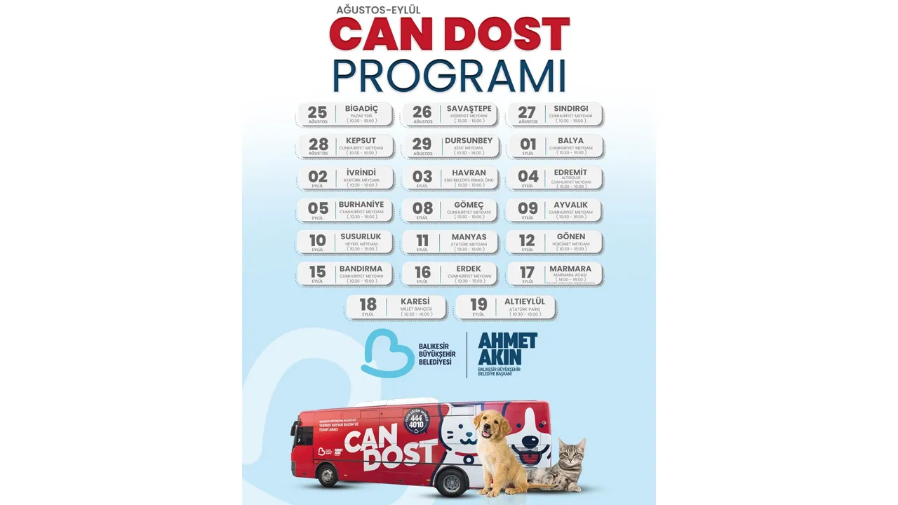 Tüm ilçeleri adım adım dolaşan Can Dost Mobil Hayvan Bakım ve Tedavi Aracı, 25 Ağustos’ta Bigadiç’ten başlayacağı yolculuğunu 26 Ağustos’ta Savaştepe’de sürdürecek. 10.30-16.00 saatleri arasında ilçelerde can dostlara bakım ve tedavi hizmeti sağlayacak olan Can Dost Mobil Hayvan Bakım ve Tedavi Aracı; 27 Ağustos’ta Sındırgı’da, 28 Ağustos’ta Kepsut, 29 Ağustos’ta Dursunbey’de, 1 Eylül’de, 2 Eylül’de, 3 Eylül’de, 4 Eylül’de Edremit, 5 Eylül’de Burhaniye, 8 Eylül’de Gömeç ve 9 Eylül’de Ayvalık’ta hizmet verecek. 10 Eylül’de Susurluk’ta can dostlara ücretsiz hizmet verecek olan Can Dost, 11 Eylül’de Manyas, 12 Eylül’de Gönen, 15 Eylül’de Bandırma, 16 Eylül Erdek, 17 Eylül’de Marmara Adası’nın yanı sıra 18 Eylül’de Karesi ve 19 Eylül’de Altıeylül’de patili dostların tedavi ve bakımını gerçekleştirecek.
