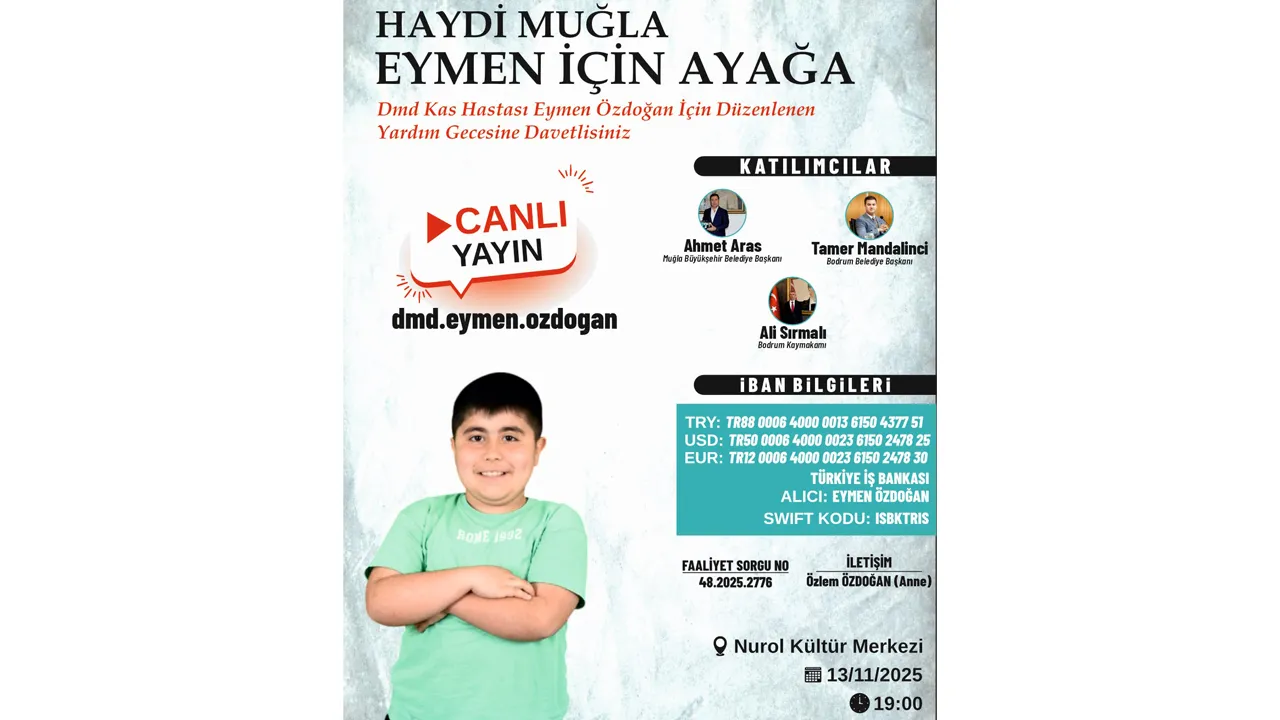 DMD kas hastası Eymen Özdoğan’ın tedavisine destek olmak amacıyla organize edilen “Büyük Yardım Gecesi”, 13 Kasım 2025 Perşembe günü saat 19.00’da Bodrum Nurol Kültür Merkezinde gerçekleştirilecek.