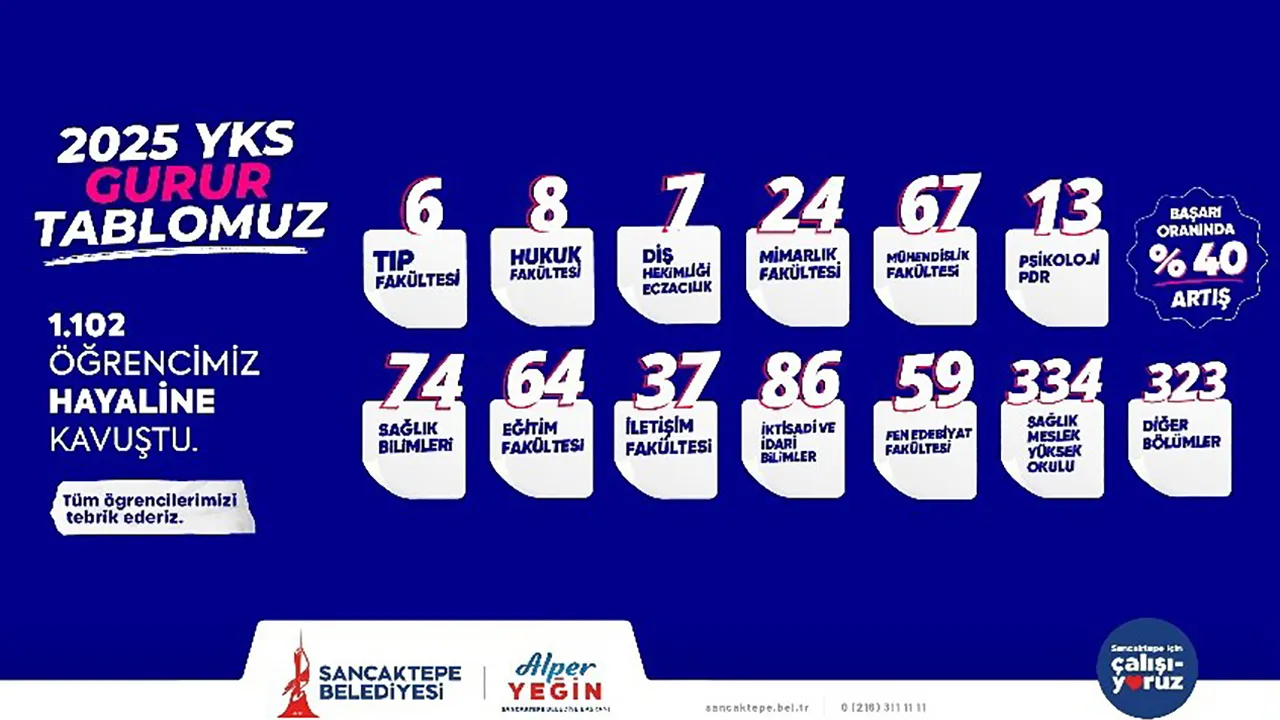 Yükseköğretim Kurumları Sınavı (YKS) sonuçlarının açıklanmasıyla birlikte pek çok öğrencinin üniversite hayalleri de gerçek oldu. Sınav hazırlık ve tercih süreçlerinde her yıl olduğu gibi bu yıl da öğrencilere ücretsiz destek sağlayan Sancaktepe Belediyesi, alanında uzman eğitmenlerle gençleri geleceğe hazırladı. Bu kapsamda Sancaktepe Gençlik Merkezlerinde eğitim gören bin 102 öğrenci, elde ettikleri başarılı sonuçlarla birlikte üniversiteye yerleşmeye hak kazandı. Bu yılki yerleştirme sonuçları, geçen yıla oranla yüzde 40 artış göstererek tarihi bir başarıya dönüştü. Sancaktepe Gençlik Merkezlerinde eğitim gören öğrencilerden 6’sı Tıp Fakültesi, 8’i Hukuk Fakültesi, 7’si Diş Hekimliği ve Eczacılık, 24’ü Mimarlık, 67’si Mühendislik, 13’ü Psikoloji ve PDR, 74’ü Sağlık Bilimleri, 64’ü Eğitim Fakültesi, 37’si İletişim, 86’sı İktisadi ve İdari Bilimler, 59’u Fen-Edebiyat ve 334’ü Sağlık Meslek Yüksekokulu olmak üzere, farklı bölümlerde eğitim hayatına adım attı.