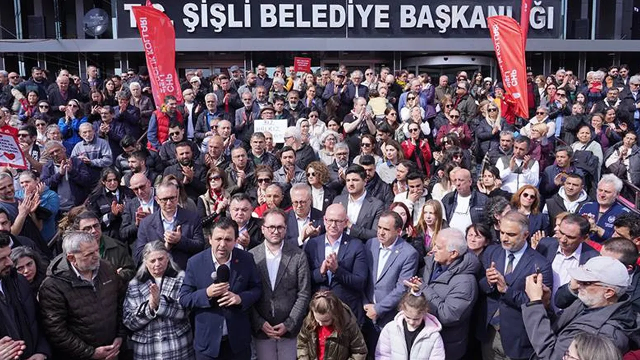 Belediye önünde toplanan binlerce Şişlili, “Emrah Başkan yalnız değildir” “Şişli Başkanının yanında” sloganları attı.