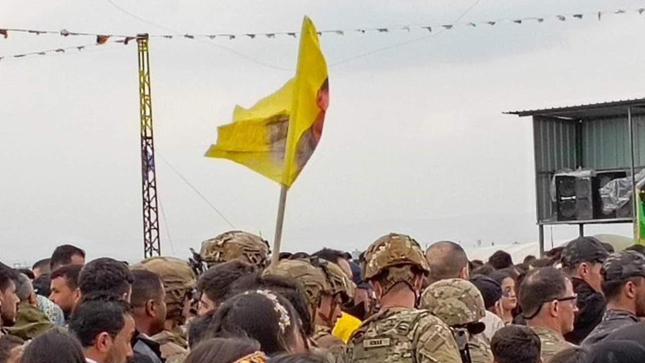 Sosyal medya hesaplarında yayımlanan videoda Derik'teki etkinlikte ABD'li kadın askerin PKK/YPG'nin kullandığı renklerde yaka süsleri taktığı görülüyor.