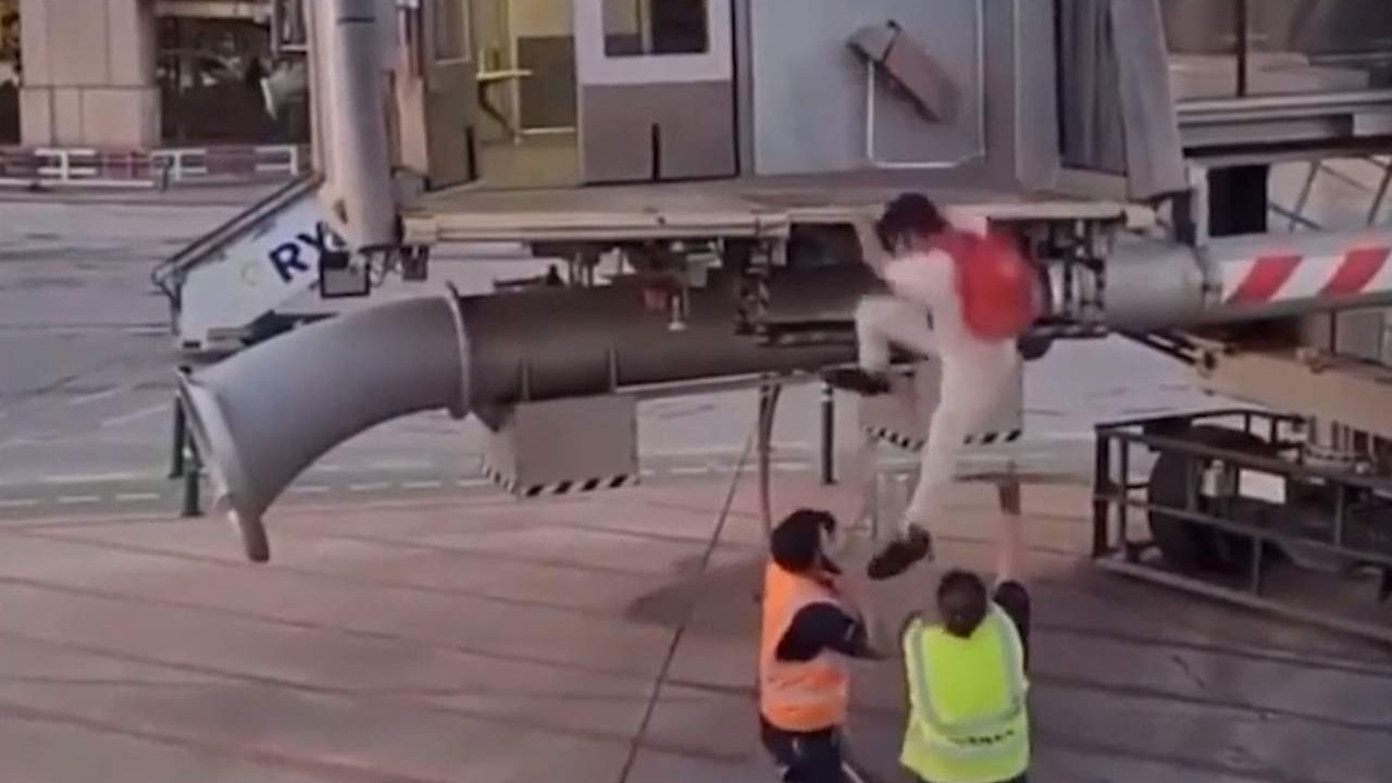 İspanya sivil havacılık dairesi AESA'dan yüklü miktarda para cezasıyla karşı karşıya kalan adamın körükten düşüşü, kaçırdığı uçuştaki yolcular tarafından kaydedildi.