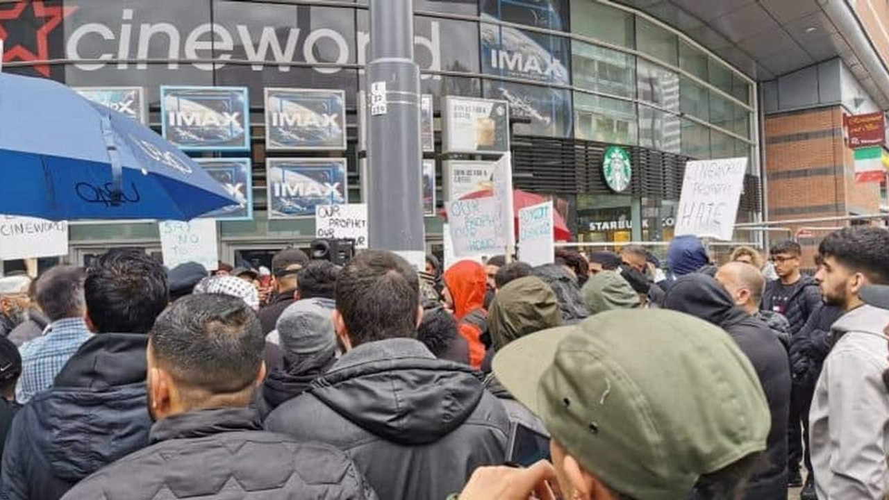 İslam dinine hakaret ettiği gerekçesiyle protesto eden bir grup Britanya’da bazı sinema salonlarının önünde toplandı.