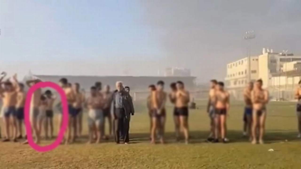Aralarında çocukların ve yaşlıların da bulunduğu Filistinlileri alıkoyan ve yarı çıplak şekilde soyarak stadyumda teşhir eden İsrail güçlerine ait tankların namlularının da bu Filistinlilere doğru çevrili olduğu görülüyor.