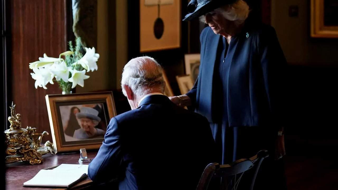 Videoda Kral 3. Charles'ın, eline mürekkep bulaşmasının ardından odayı terk ettiği ve deftere imzayı eşi Camilla'nın attığı görüldü.