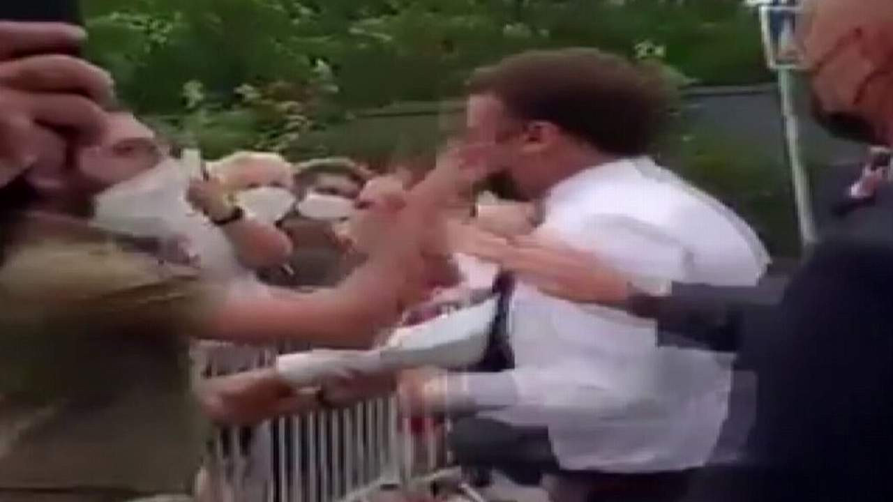 Macron, Tain-l'Hermitage kentinde turizm otelcilik lisesini ziyareti sonrasında bariyerlerin arkasında kendisini bekleyen kalabalığa tokalaşmak için yaklaşmıştı. Kalabalıktan bir kişi bir eliyle kolunu tuttuğu Macron’a diğer eliyle tokat atmıştı. (AA)