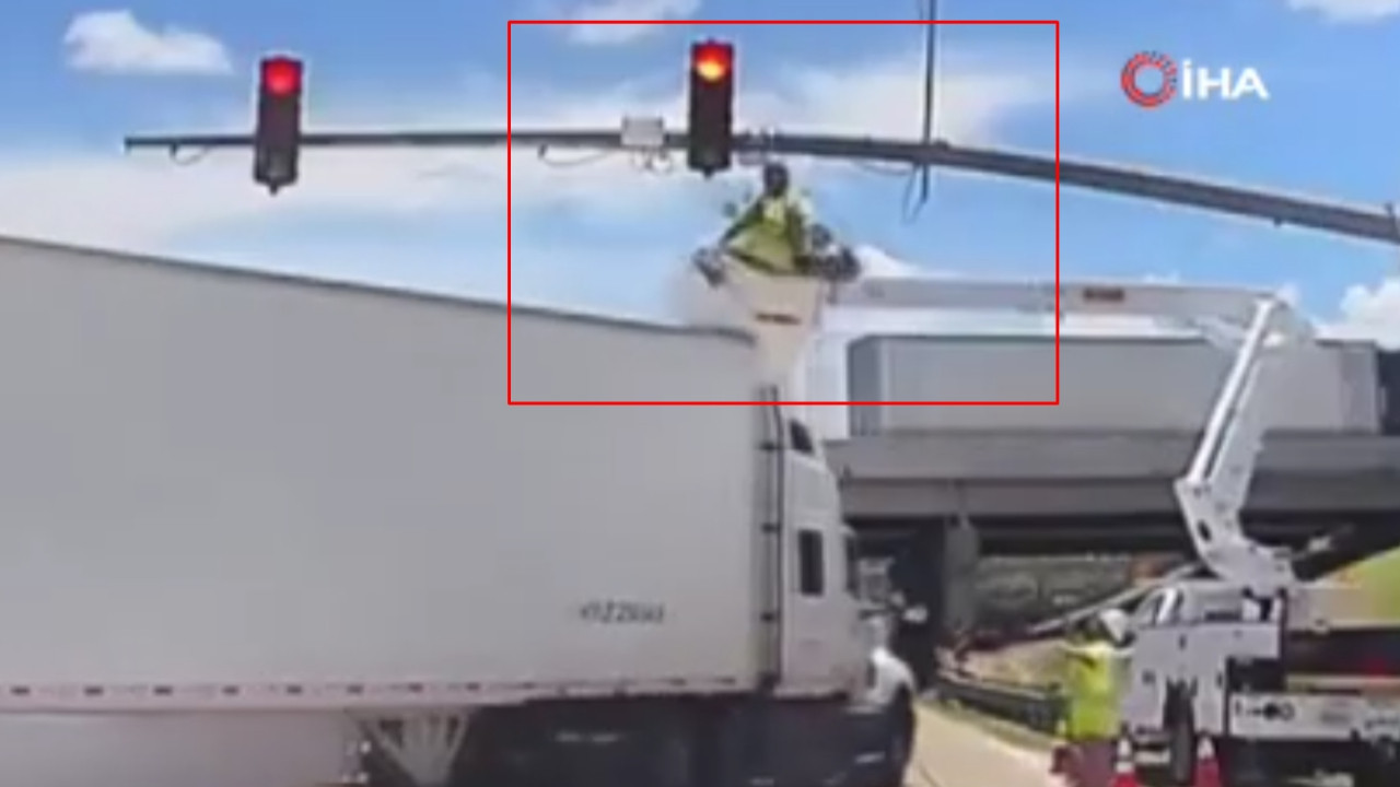 TIR, trafik ışıkları için sepetli vinç üzerinde çalışan işçiye çarptı