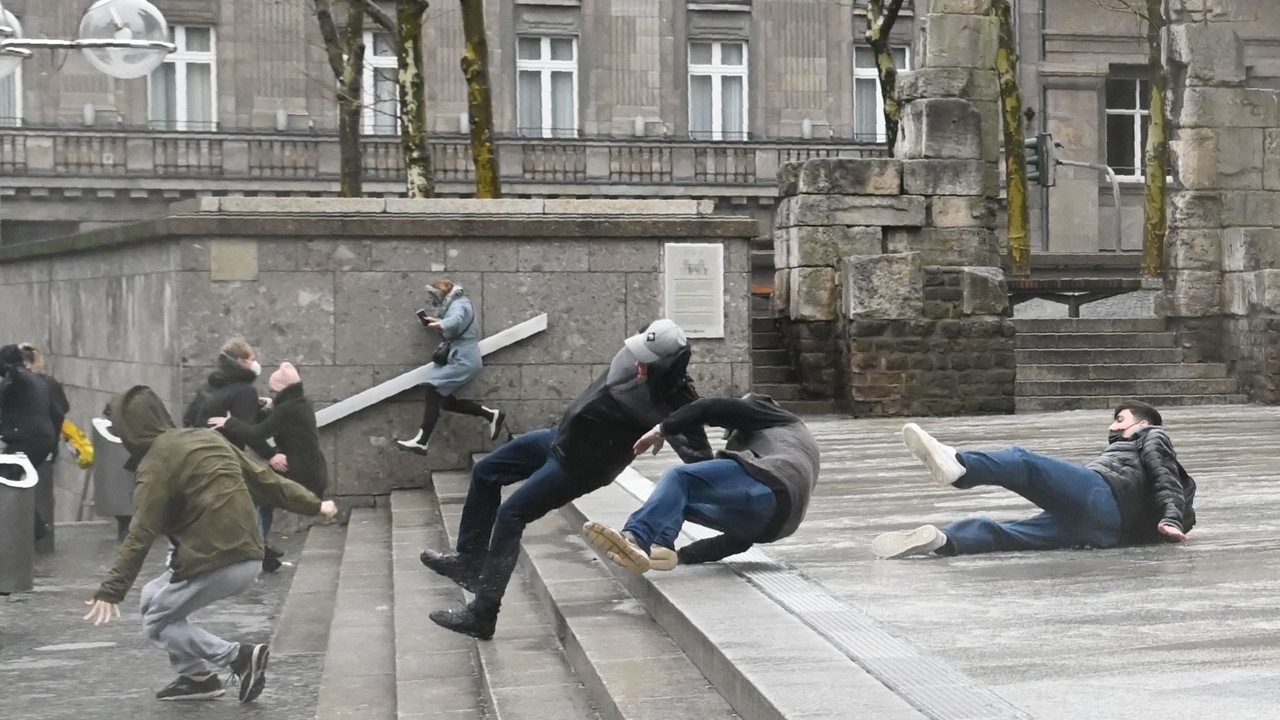Yürüyen insanlar fırtınanın gücüne boyun eğmek zorunda kaldı. Yerlerde sürüklenen insanların düştüğü durum tabiatın gücün gözler önüne serdi.