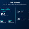 Türk Telekom, 2023 birinci çeyrek finansal ve operasyonel sonuçlarını açıkladı. Şirketin konsolide gelirleri yıllık bazda yüzde 61 artarak 15,3 milyar TL'ye ulaştı. FAVÖK’ü (Faiz, amortisman ve vergi öncesi kâr), yüzde 31,3 FAVÖK marjı ile 4,8 milyar TL olan Türk Telekom’un ilk çeyrekteki net kârı ise 645 milyon TL oldu.