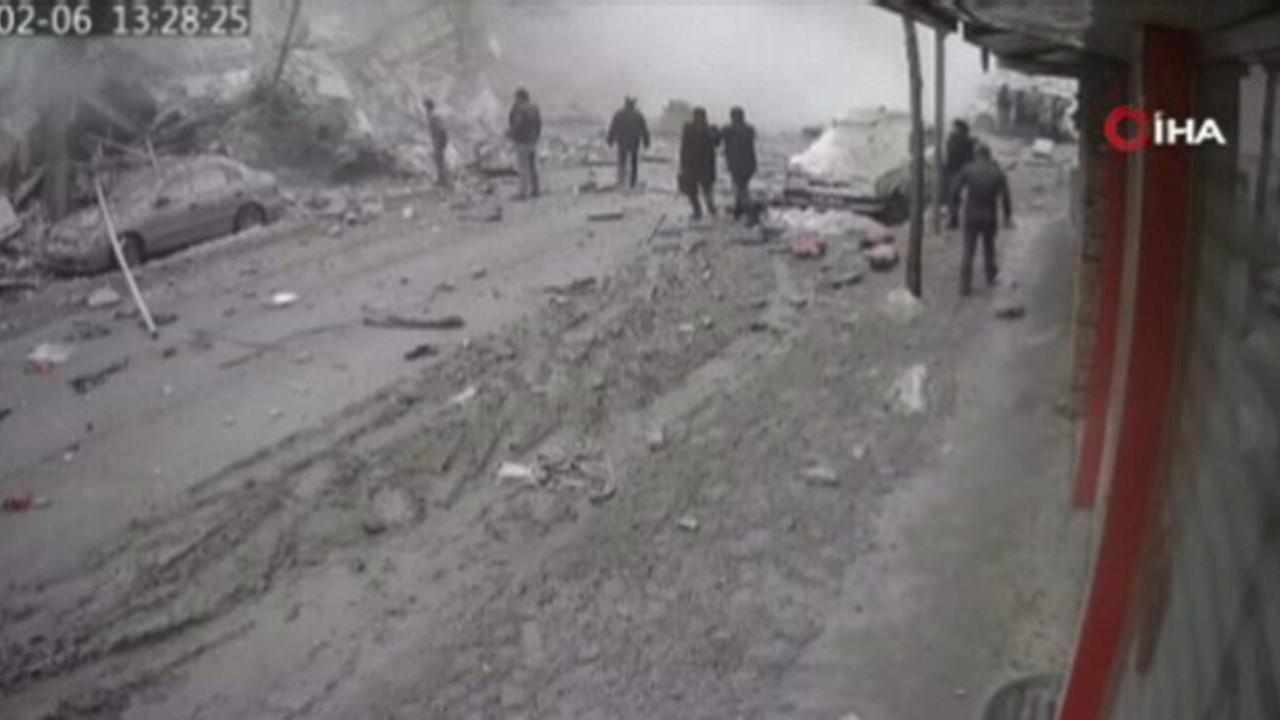 Görüntülerde depremle birlikte yoldaki insanların sağa sola kaçışma anlarının ardından biranda ortalığı toz bulutun kapladığı apartmanın ise saniyeler içerisinde yerle bir olduğu görülüyor.