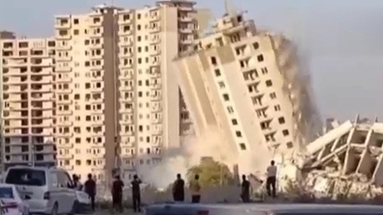 Hatay'ın Defne ilçesinde depremde ağır hasar alan 16 katlı rezidans, dinamitle kontrollü olarak yıkıldı.