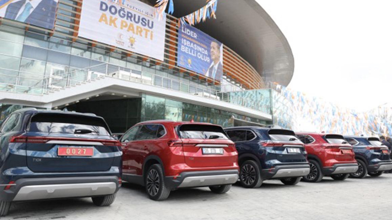 Toplantının yapıldığı salonun önünde, "Anadolu kırmızısı" ve "Gemlik mavisi" renklerindeki Togg otomobillerin yan yana park edildiği görüldü.