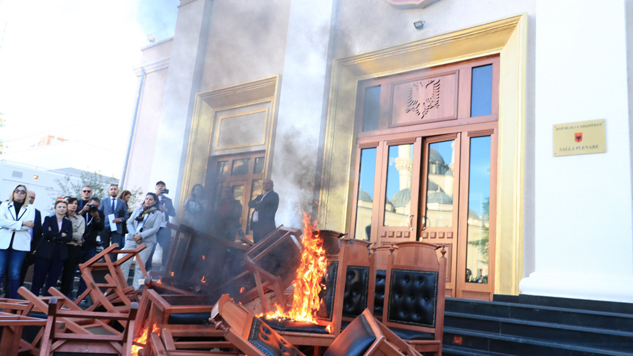 Arnavutluk Meclisinde düzenlenen oturumda yaşanan arbede ve gerginliğin ardından muhalefet milletvekilleri, meclis binası dışında sandalyelerini ateşe verdi.