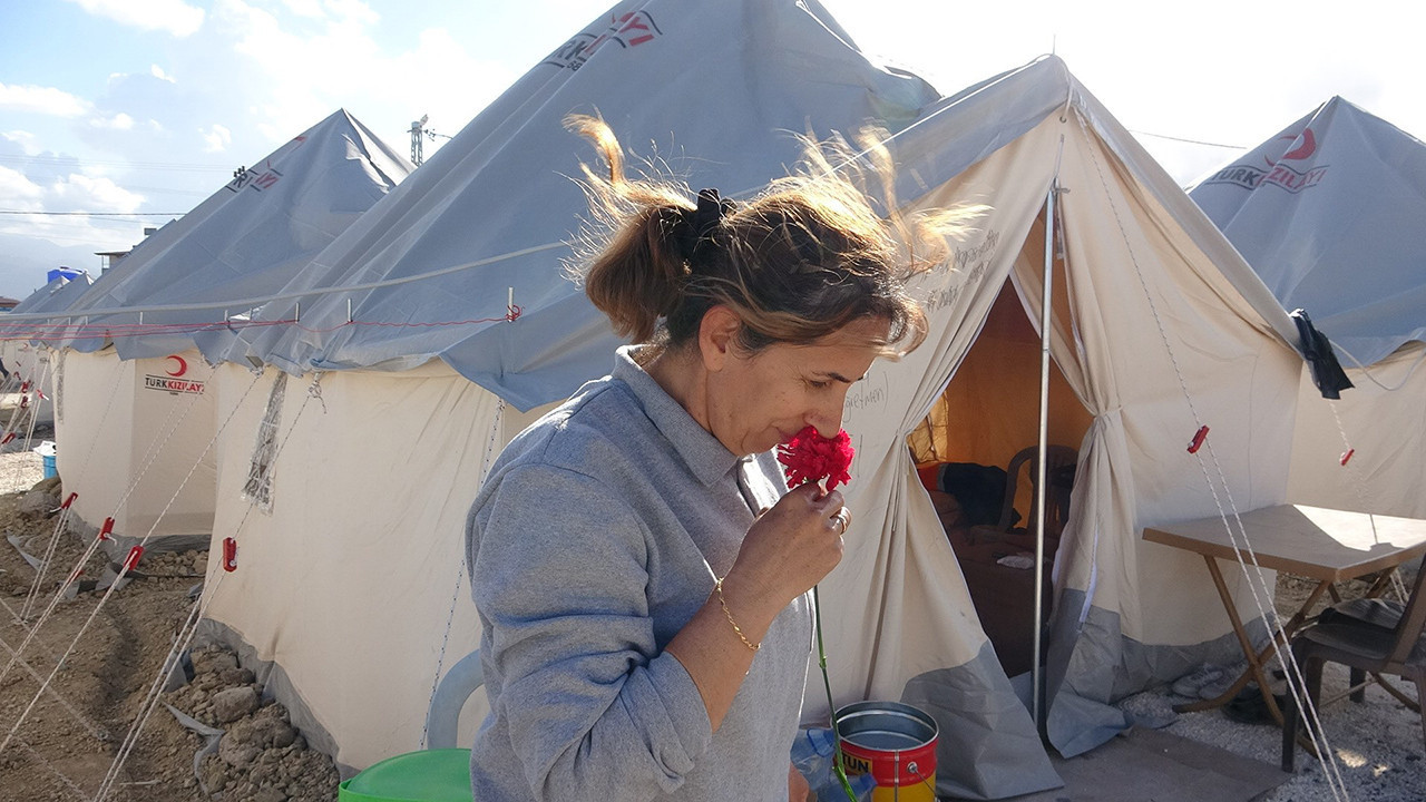 Depremin vurduğu Hatay'ın Defne ilçesinde çadır kentteki kadınlara 8 Mart Dünya Kadınlar Günü nedeniyle karanfil verildi.