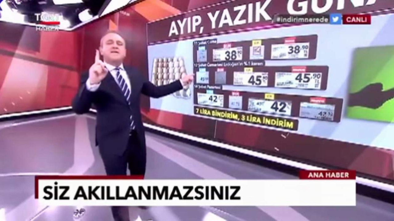 Dün zincir marketler art arda KDV indirimi yaptıklarını açıklasa da raflarda gerçeklerin öyle olmadığı çok kısa bir sürede anlaşıldı. Marketlerin fiyatları önce artırıp sonra cüzi bir miktar indirim yaptığı gerçeği ise TGRT Haber anchormanı Ekrem Açıkel'i çıldırttı.
