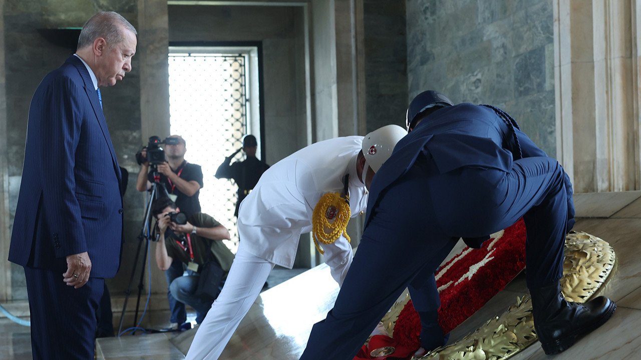 Cumhurbaşkanı Erdoğan'ın ay yıldız motifli çelengi Atatürk'ün mozolesine bırakmasının ardından saygı duruşunda bulunuldu, İstiklal Marşı okundu.
