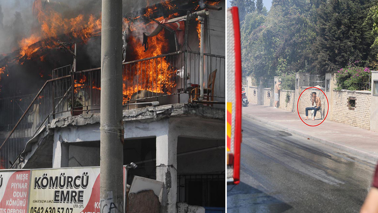 Antalya'nın Muratpaşa ilçesinde evini benzin döküp ateşe veren bir kişi, yolun karşısına geçip, oturduğu tabureden yangını izledi.