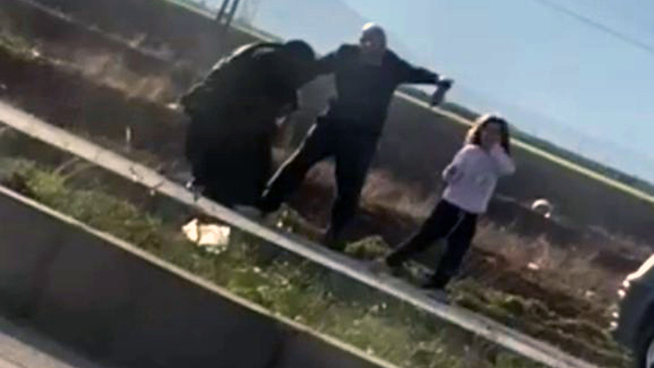 Bu sırada araçtaki kız çocuğu da inerek, çifte engel olmaya çalıştı. Adam, çocuğa tokat atarken genç kadını araca bindiren çift daha sonra yolculuğa devam etti.
