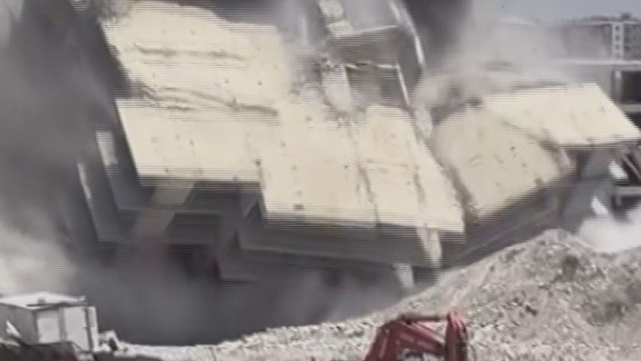 Hatay'ın Antakya ilçesinde 12 katlı binanın iş makinesinin darbesiyle yıkımı vatandaşlara deprem etkisi yaşattı. Kontrollü olarak yıkılan binanın yerle bir olduğu anlar kameraya yansıdı.