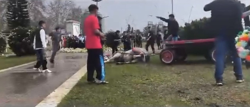 Merkez Park’ta yaşanan ve izleyenlerin kanını donduran olayda, bir şahıs arabaya bağlı olan atını "koşmadığı" gerekçesiyle sopa, tekme ve yumruklarla darp etti.