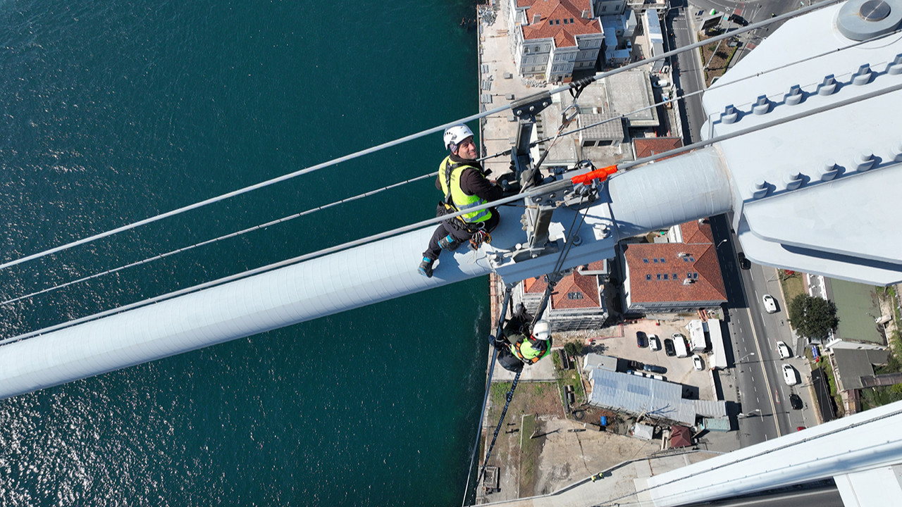 İstanbul’un en gözde yapılarından 15 Temmuz Şehitler Köprüsü üzerinde işçilerin bakım onarım çalışmaları havadan görüntülendi.