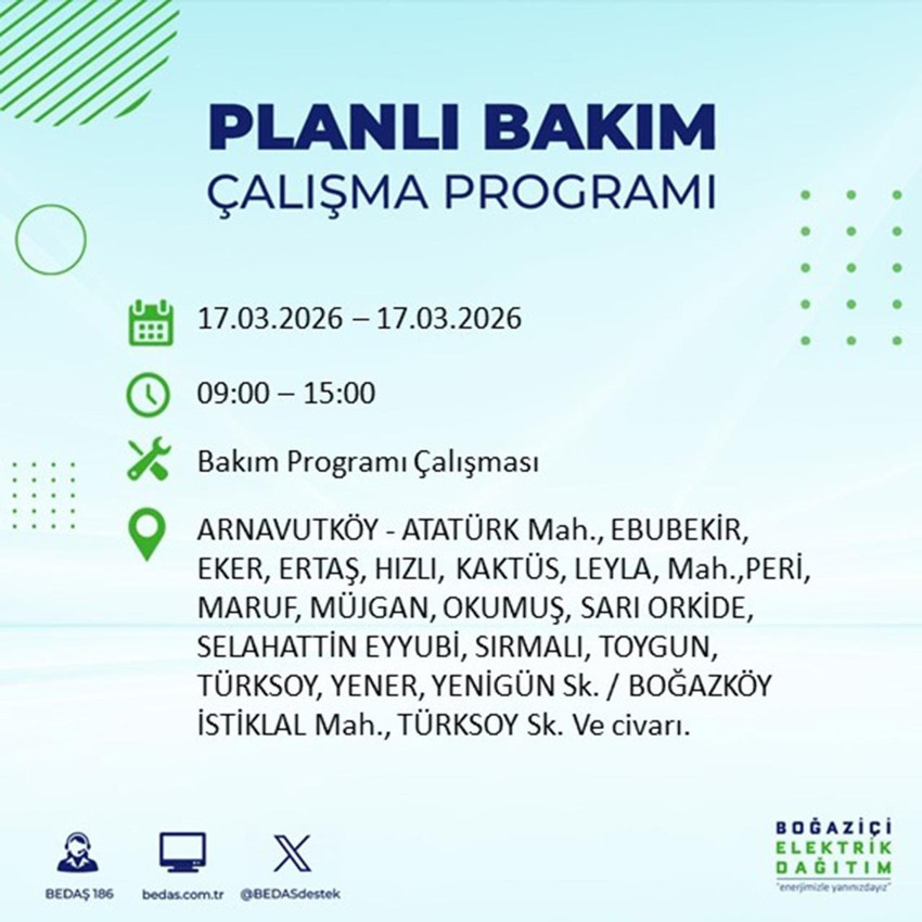 Boğaziçi Elektrik Dağıtım A.Ş. (BEDAŞ), İstanbul genelinde enerji altyapısını güçlendirmek ve olası arızaların önüne geçmek amacıyla yürütülen planlı bakım ve yatırım çalışmaları kapsamında yarın yapılacak kesintilerin listesini yayınladı. 17 Mart 2026 Salı günü gerçekleştirilecek çalışmalar, İstanbul'un Avrupa Yakası'ndaki 23 ilçede belirli bölgeleri etkileyecek. İşte 17 Mart 2026 elektrik kesintisi programı...