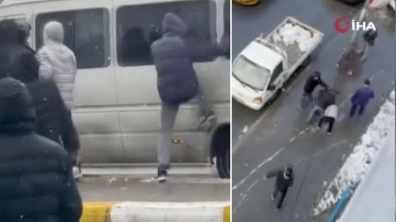 Ardından başka bir noktada bir servis aracına kar topu atan bir düzine genç, servis şoförünün tepki göstermesi üzerine önce arabayı tekmeledi ardından kavga çıktı. Yaşanan o anlar vatandaşlar tarafından cep telefonu kamerası ile görüntülendi.