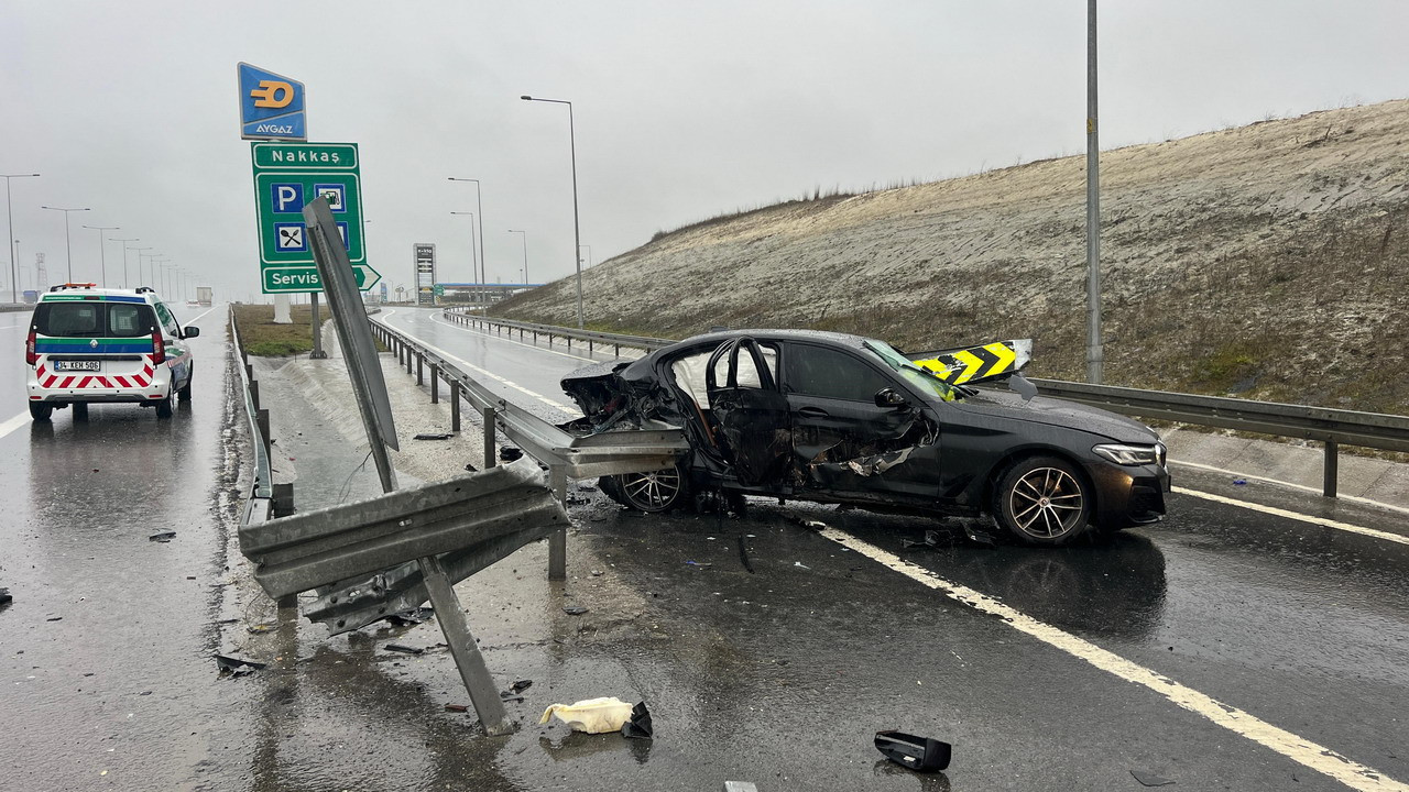 Kuzey Marmara Otoyolu Çatalca mevkisinde sabah saat 10.00 sıralarında yaşanan kazada, sürücüsünün direksiyon hakimiyetini kaybetmesi sonucu kontrolden çıkan lüks araç, petrol istasyonu ayrımında bariyerlere çarptı.
