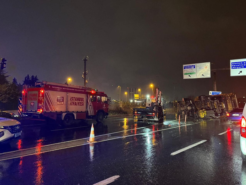 İstanbul Bakırköy'de yağmurun kayganlaştırdığı yolda hafriyat kamyonu devrildi, ortalık savaş alanına döndü. Kazayı görüp yardım etmek için aracından inen bir sürücü, arkadan gelen bir başka otomobilin çarpmasıyla ağır yaralandı. Atatürk Havalimanı Yolu üzerinde yaşanan can pazarında 2 kişi hastaneye kaldırılırken, trafik durma noktasına geldi.