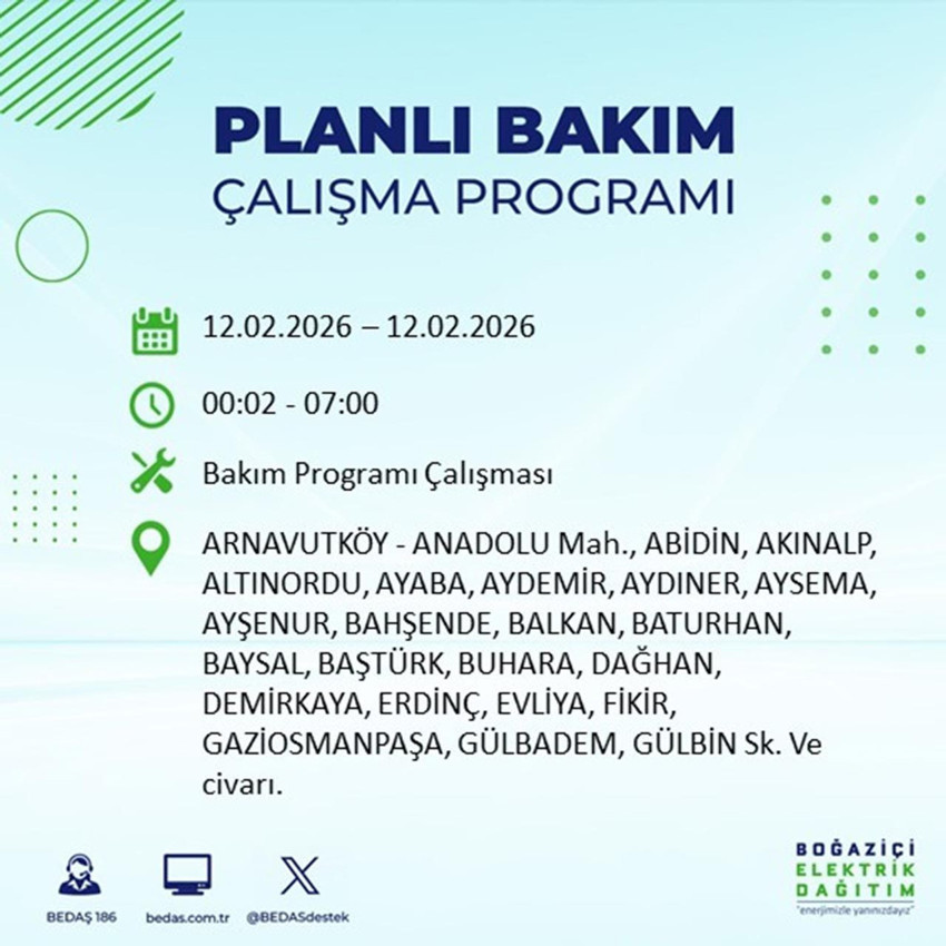 İstanbul'da 12 Şubat Perşemne günü elektrik kesintisi yapılacak ilçeler açıklandı. Boğaziçi Elektrik Dağıtım A.Ş. (BEDAŞ) tarafından yapılan açıklamaya göre, planlı bakım ve yatırım programı kapsamında 21 ilçede bazı mahalle ve sokaklara elektrik verilemeyecek. Birçok noktada saat 09.00 ile 17.00 arasında kesinti yapılacak. İşte 12 Şubat 2026 elektrik kesintisi programı...