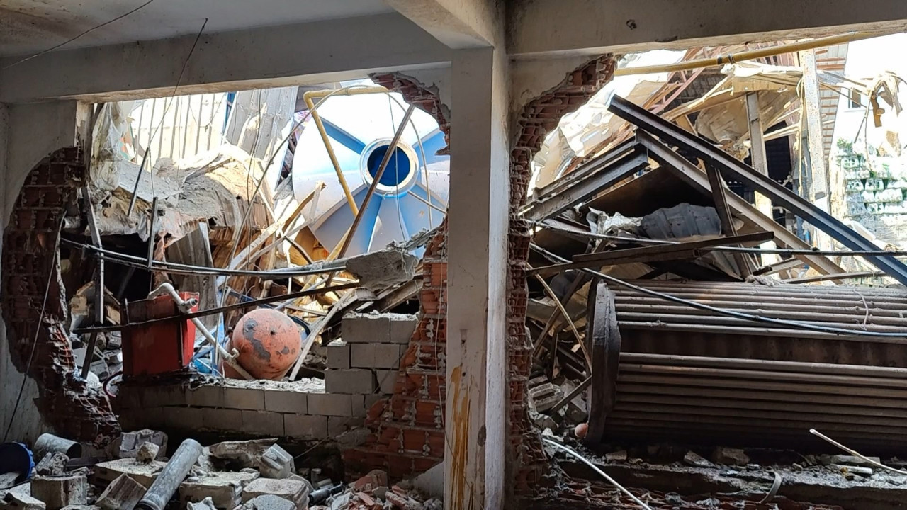Yaşanan patlamanın yol açtığı hasar, havadan görüntülendi. Görüntülerde atölyenin yanında bulunan gıda deposunun büyük hasar aldığı görüldü.