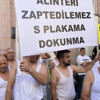 Kemeraltı Çarşısı'ndaki İzmir Büyükşehir Belediyesi binası önünde toplanan gruptakiler kıyafetlerinin üst kısımlarını çıkarıp pankart açtı.