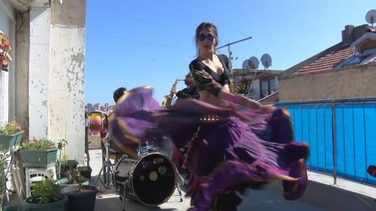 Koronavirüs salgını kapsamında evlerinden çıkamayan komşuları için terasta iki müzisyen konser verdi. İki müzisyene dansçı arkadaşları kıvrak figürleriyle eşlik etti.