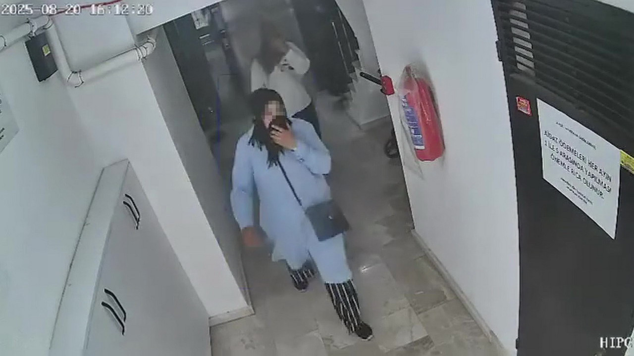 Evin içine giren kadın, ayakkabılarıyla odalarda dolaşarak değerli eşya aradı. Bu sırada apartman koridorunda bekleyen bir kadın, başını içeri uzatıp kontrol ettiği sırada güvenlik kamerasını fark ederek geri çekildi.