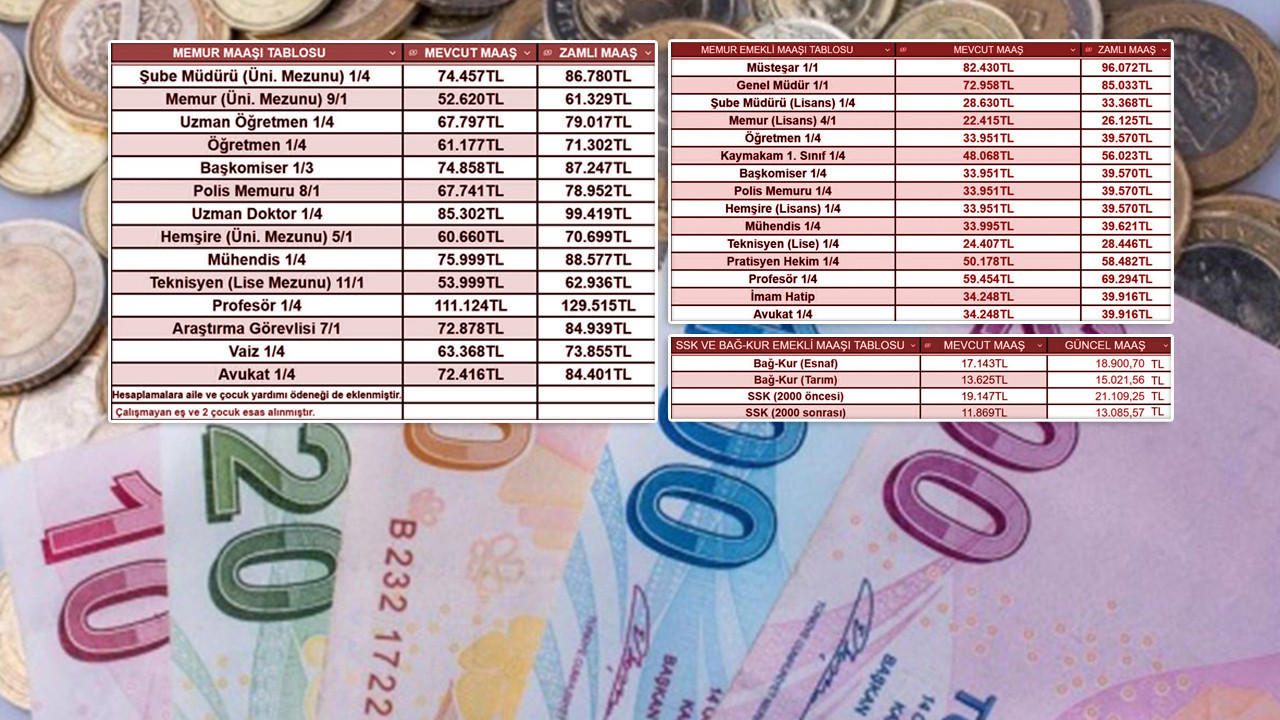 Her yıl ocak ve temmuz ayları olmak üzere yılda iki kez zam alan memur, memur emeklileri, SSK ve Bağ-Kur emeklilerinin de 4 aylık enflasyon rakamlarının netleşmesiyle birlikte maaş zam oranları belli olmaya başladı.