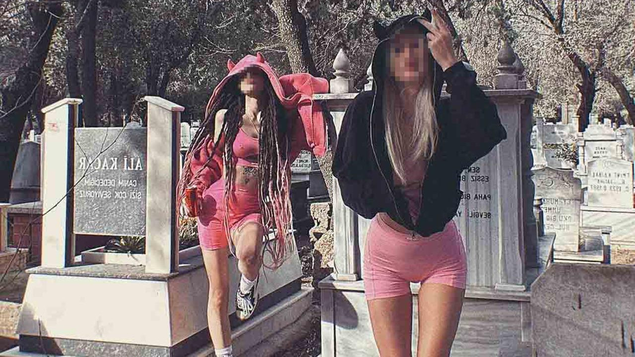 Mezar taşlarının üzerine oturup iskambil kağıdı oynayan ve kola içen 2 kadın, kayda aldıkları o görüntü ve fotoğrafları da sosyal medya hesaplarında paylaştı.