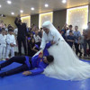 Judo antrenörlüğü yapan siyah kuşak sahibi gelin ile damat nikah öncesi judo kıyafeti giyerek gösteri yaptı. Gösteride gelin, damadı yerden yere vurarak unutulmaz anların yaşanmasına neden oldu.