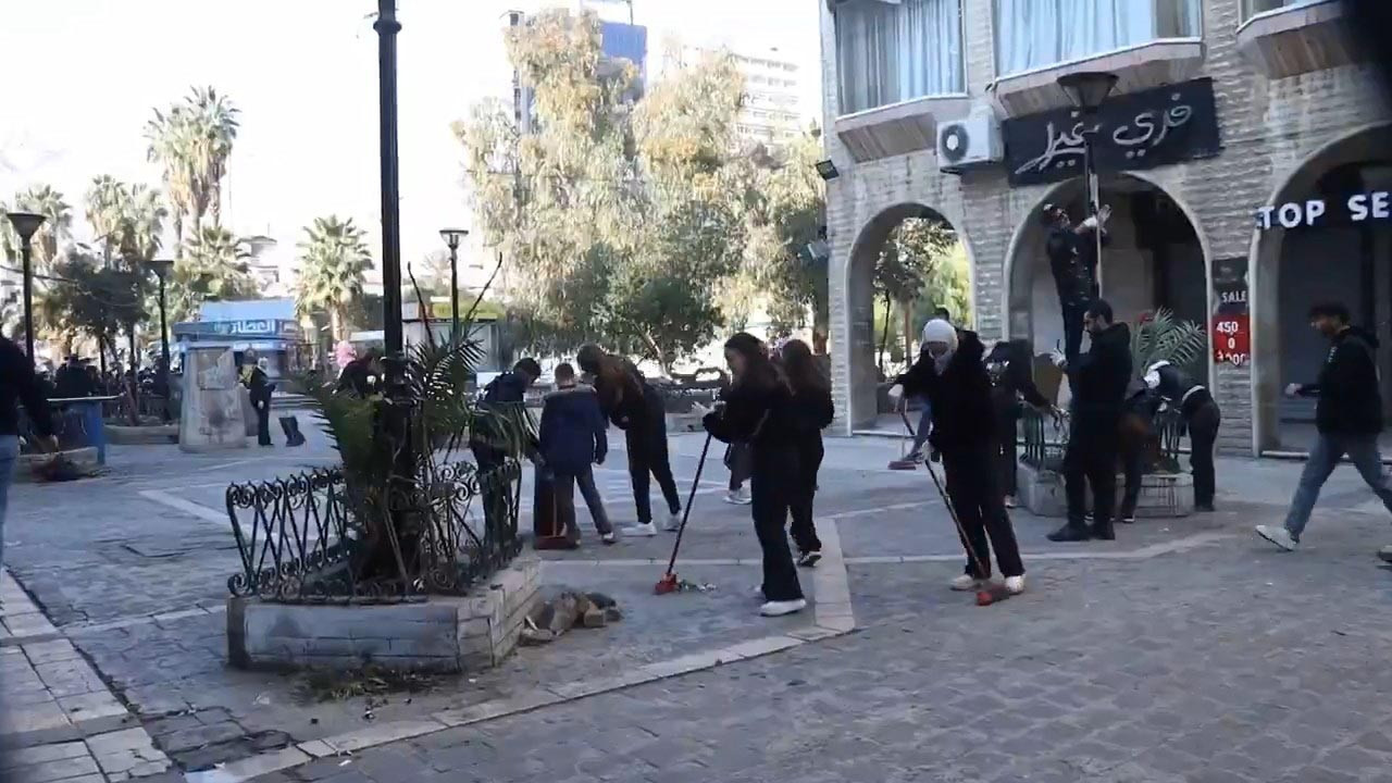 Suriye'nin başkenti Şam'da belediye hizmetlerinin henüz başlamaması nedeniyle temizlik çalışmalarını halk ve gönüllü ekipler üstlendi.