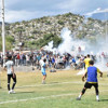 Konuk ekibin taraftarları henüz bilinmeyen bir nedenden dolayı telleri yıktı. Bu sırada sahaya meşaleler ve taşlar atılmaya başlandı. Atılan taşların isabet ettiği 1’i futbolcu 3 kişi yaralandı.