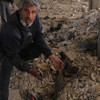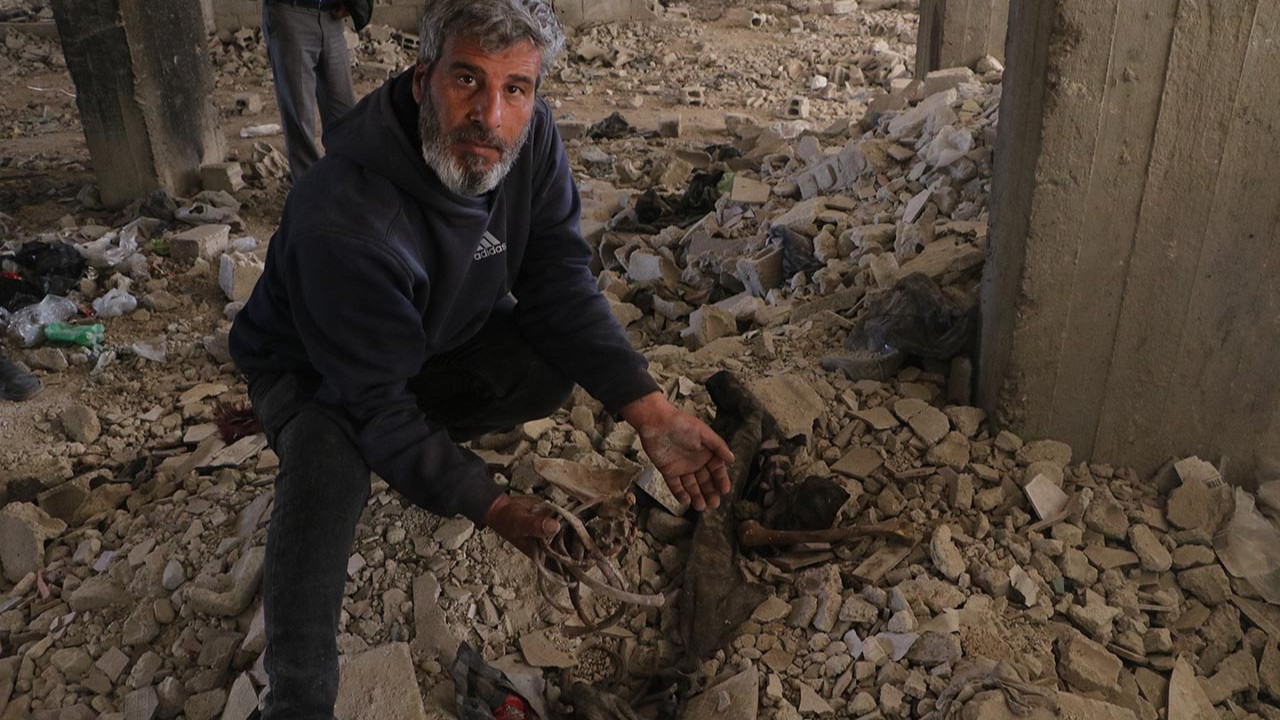 Suriye'nin başkenti Şam'da, Esad rejiminin saldırıları sonucu enkaza dönen Tadomon Mahallesi'nde binaların altından insan kemikleri çıkartıldı.