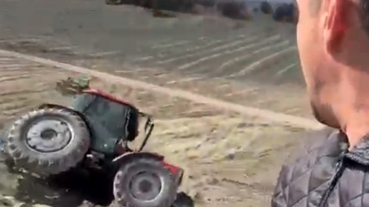 Burdur'da tarlada çalışan Ş.D.'in (61) yokuştan kayarak devrilen traktörün altında kalarak yaşamını yitirdiği kaza, kameraya yansıdı.