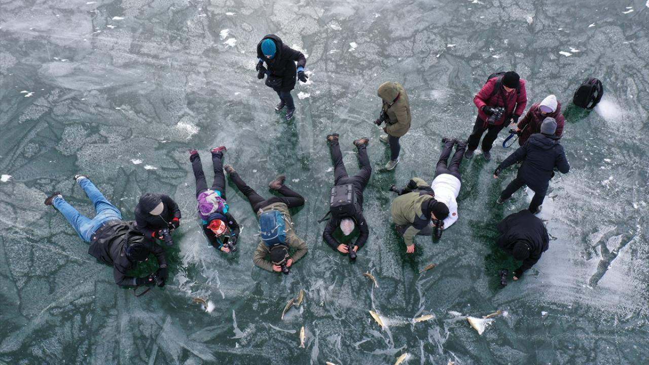 Doğu Anadolu Bölgesi'nin saklı güzellikleri arasında yer alan Ağrı'daki Balık Gölü, yüzeyi buzla kaplı görüntüsüyle fotoğraf tutkunlarının uğrak yeri haline geldi.
