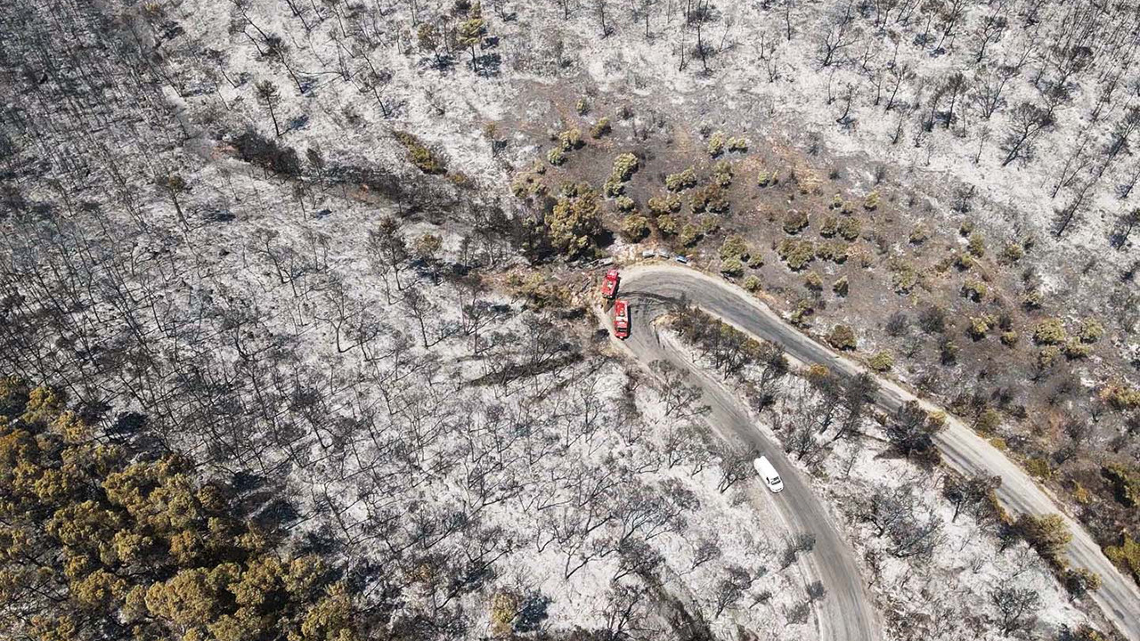 Görüntülerde, yanan alanlar ve orman söndürme işçilerinin bölgede halen yürüttüğü soğutma çalışmaları da yer aldı.