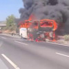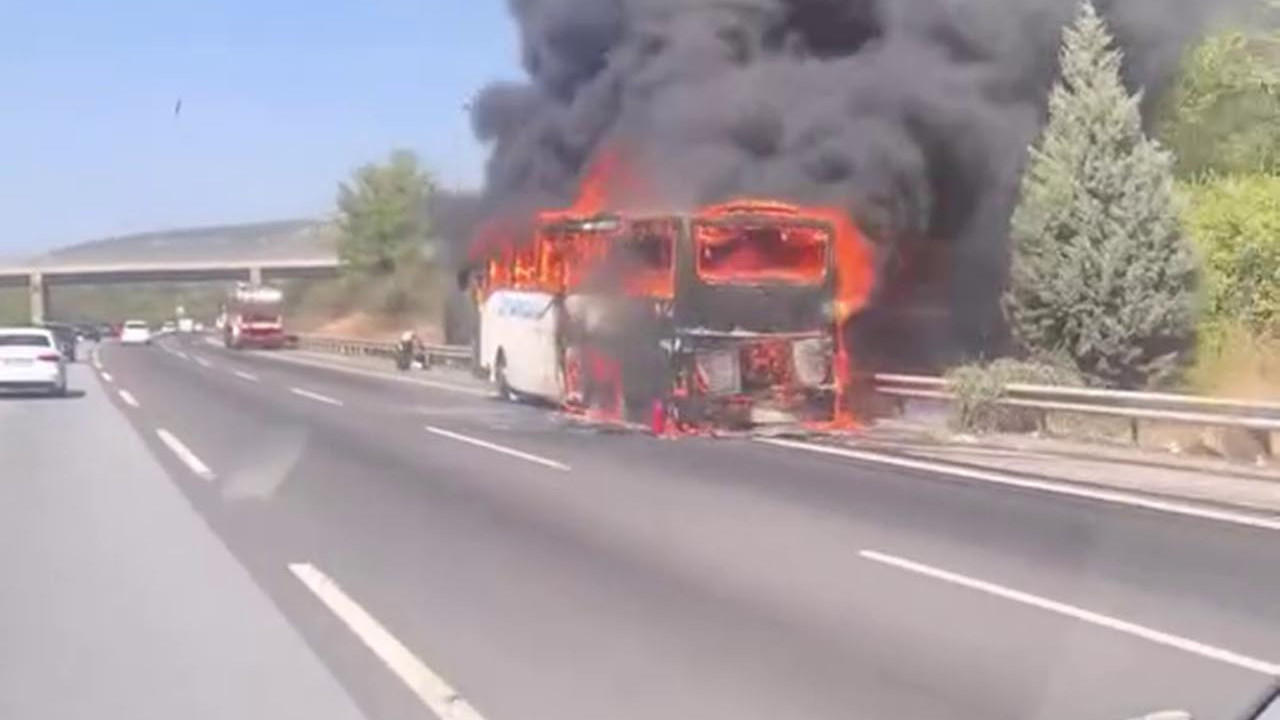 M.B. otobüsü emniyet şeridine çekerek 7 yolcu ve 2 personeli tahliye etti. İhbar üzerine bölgeye sevk edilen itfaiye ekipleri, alev alev yanan otobüse müdahale etti.