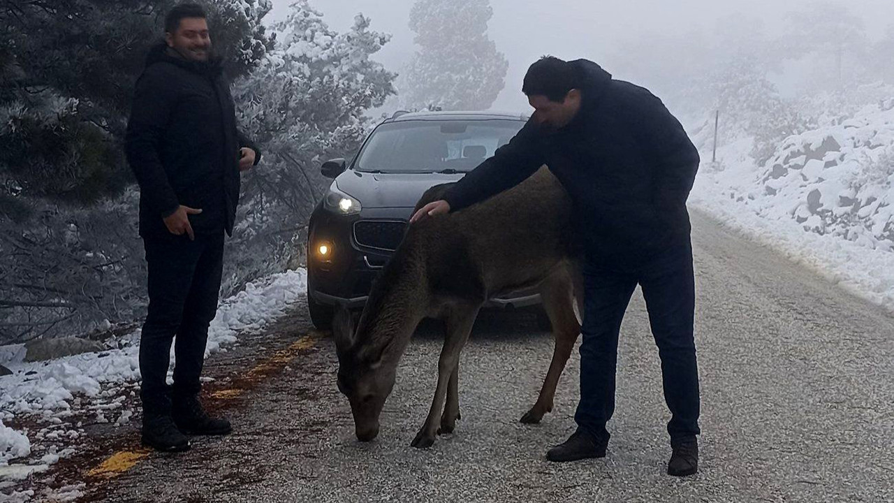 Burdur'daki Salda Kayak Merkezi'ne çıkan bir grup, yolda karşılarına çıkan kızılgeyiği besleyip fotoğraf çekti.