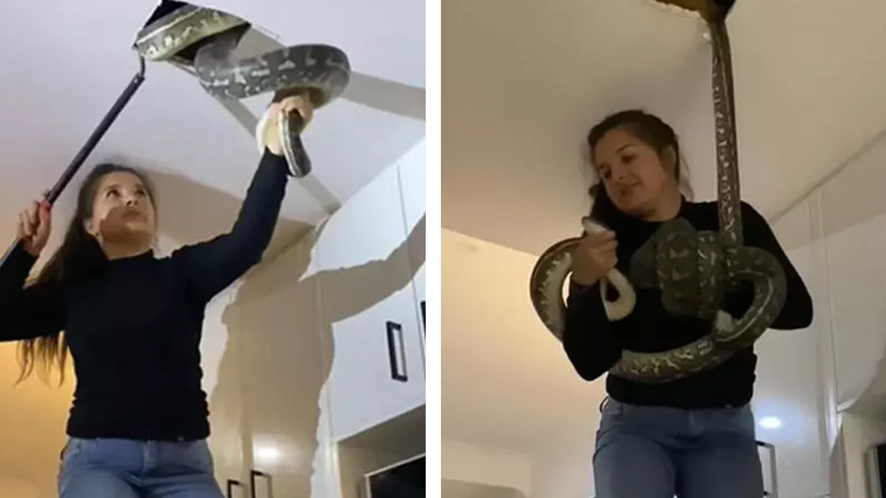 Korku dolu anlar! Tavandan çıkan 2 pitonu eliyle böyle yakaladı
